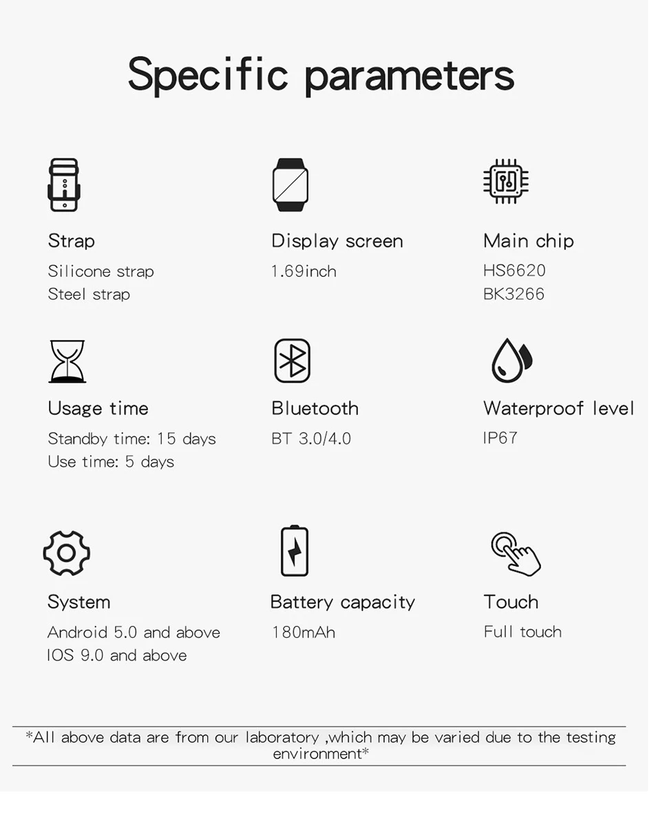 Stay powered and connected with the 1.69-inch full touch smartwatch built for both style and performance. Featuring Bluetooth 3.0/4.0, a 180mAh battery offering up to 15 days standby and 5 days of use, and IP67 waterproof protection for everyday durability. Compatible with Android 5.0+ and iOS 9.0+, this smartwatch combines smart connectivity, comfort, and sleek design perfect for active lifestyles.
